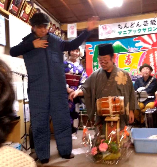 寒い屋外で着物を着る場合、防寒着には羽織・道行・角袖・インヴァネスコートなどが主に用いられますが、ちんどん屋さんの演奏をするときに、そういった防寒着を着てやるわけにはいかない。