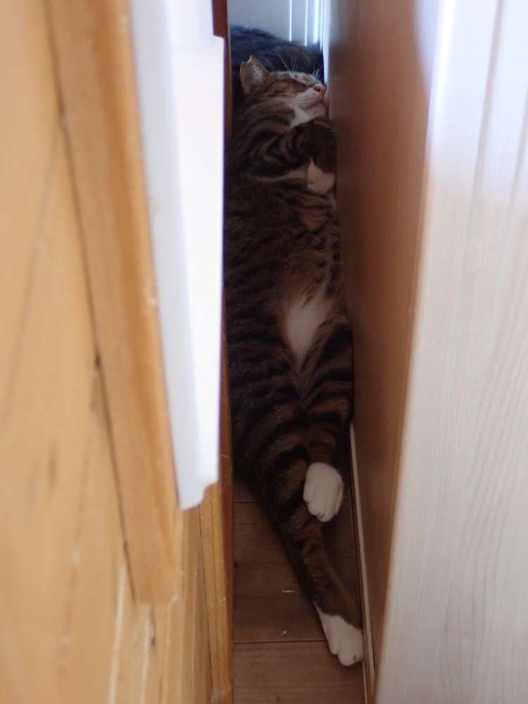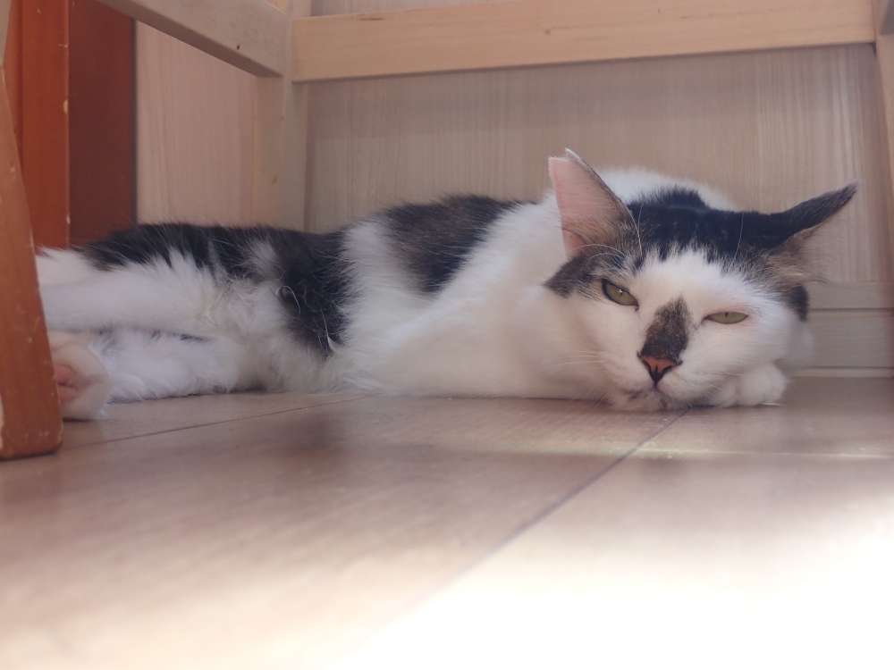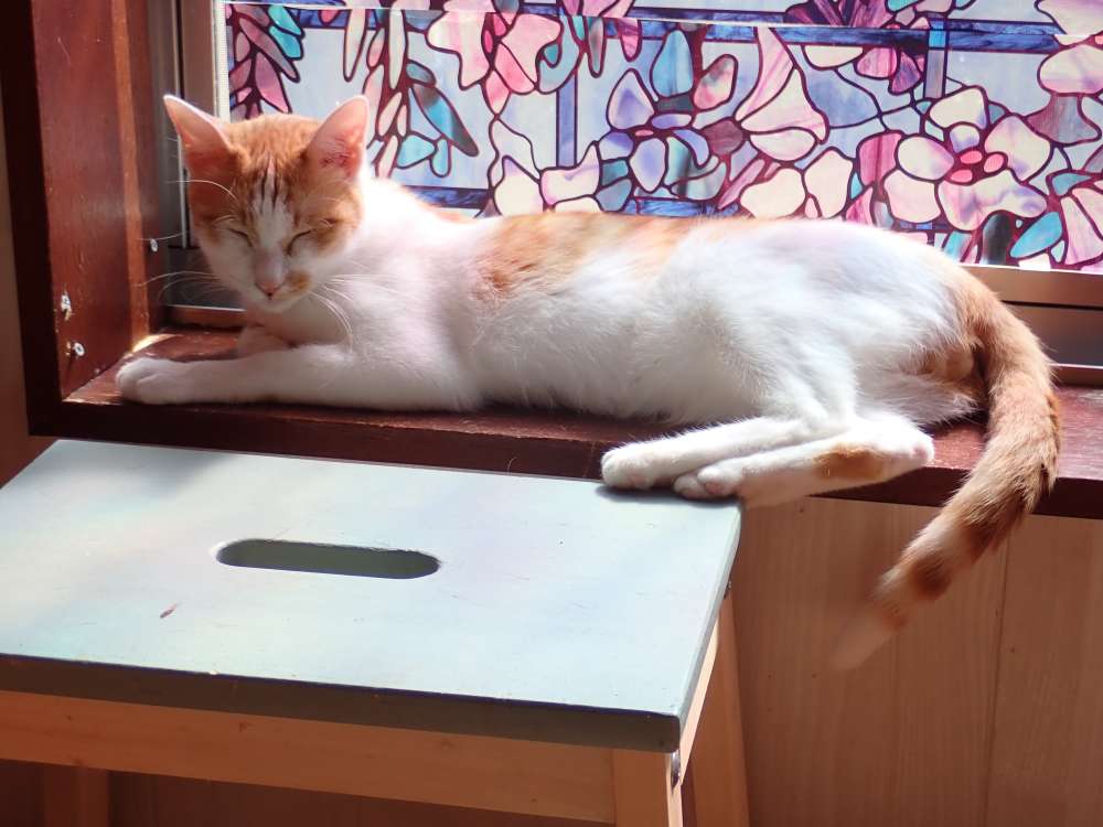 帰り際、お会計をしてるときに見かけた、肉球を出して寝ているニャンコさん。寝ている猫って本当に癒やされます。