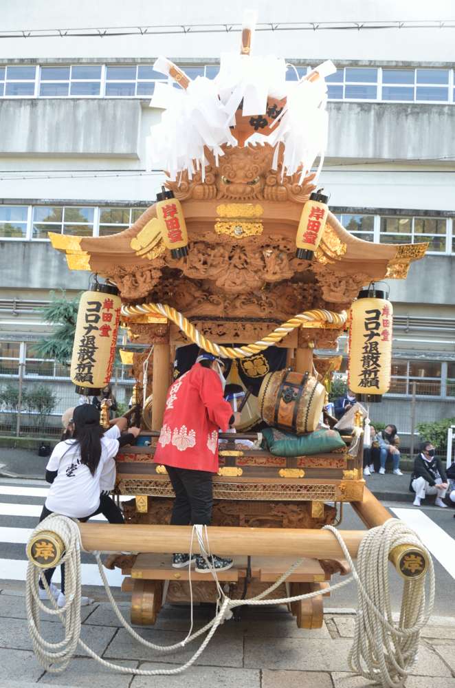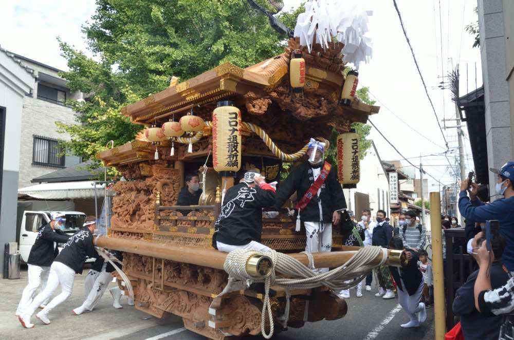 コロナ拡散防止のため、だんじりに関係する人間は全員マスク・フェイスシールド着用で臨むことに。