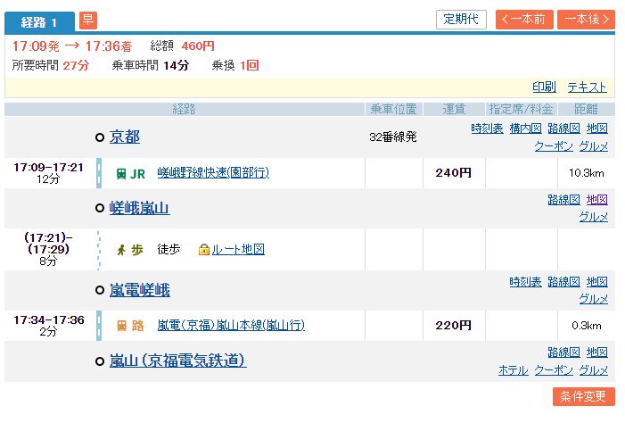 アプリなので嵐電に一駅だけ乗る検索結果が出ていますが、実際にはJR嵯峨嵐山駅から歩いて15分ほどで、渡月橋まで行けます。
