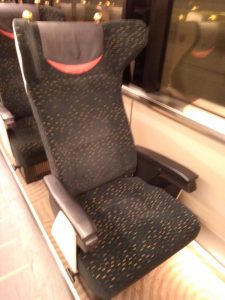 ちなみに赤特急のものですが、プレミアムカーの車内はこんな感じです。3列シートで、もしこれにフットレストがついたら「グリーン車並の装備」です。(写真ちょっとブレていてご容赦を)