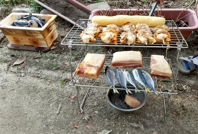 主催者は豚バラの塩漬け(ベーコン)、お友達のひとりは焼き鳥やフライドチキン。別のお友達は、魚の干物や、自宅の畑でとれた野菜を持参。野菜は燻製にしてもあまり美味しくないらしいので燻製にせず、別途サラダや、炭火焼きや、すき焼き風煮込みに料理。