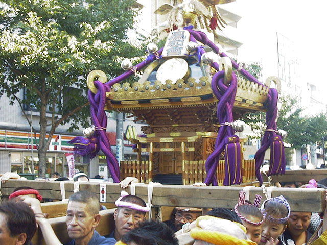 午後1時に神輿があがり、千川通りをゆっくり往復します。神輿は台輪で2 尺5寸位。延べ屋根、素木仕上げの堂には正面の御霊入れの扉以外の3面は彫 り物がしてあります。彫り物は波の模様がはいり、台輪に「箪笥」がついてい る事から、昔は湘南地方で使われていた神輿ではないかと思います。鳳和会さ んの渡御も帰路はどっこいで渡御したこともあるんだそうです。 接待はお茶とレモン水程度で酒は一切出ませんが、なぜか酒屋の前で休憩す るので、缶ビールの調達には全く支障がなく、結局3本飲んでしまいました。 暖かい日差しに軽くほろ酔い。いい気持ちになりました。 4時少々回った頃に出発点に戻り、神輿をおさめて直会開始。たくさんの同 好会が集合した鳳和会さんの神輿渡御は天候にも恵まれ大成功でした。 はっちゃん QZM02610@nifty.ne.jp でした。 |