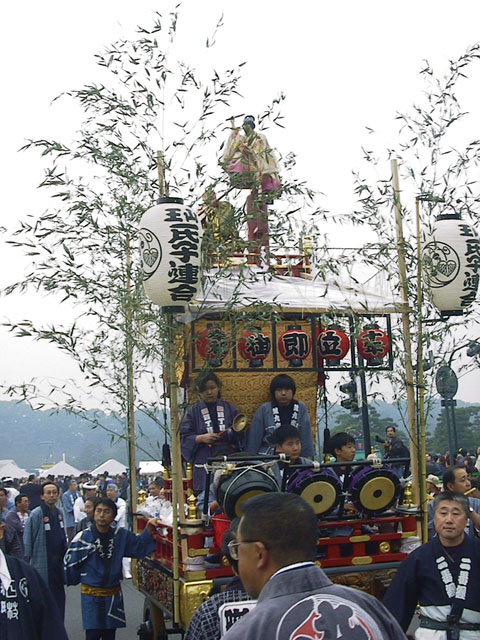 | 【当日迄】 「天皇在位10年だから今年は神輿が出そうだ」って情報は大分前から流れて ましたが、日時その他の詳細がわかったのは、10月終わり頃。そして、極めて とりにくい半纏をつてを辿ってなんとかなったとの連絡が来たのは、11月3日 でした。 半纏が用意できて休みがとれた(強引にとった!?!)「祭道」のメンバーは 総勢7名。N代行、Oさん、Mさん、みっちゃん、大将、ペンギン君とはっち ゃん.....でした。 神輿を出したのは、神田神社と日枝神社。 はっちゃん達は日枝神社の方の半纏です。当日1時に八丁堀町会のTさんと 待ち合わせをして八丁堀区民館で仕度をします。なるべく締め込みは遠慮して ほしいとの事で下は白の股引にします。当日は朝雨でしたし、夕方の神輿なの で寒さしのぎにもそれはそれで好都合。お借りしたのは背中に「八三東」の牡 丹文字の入った八丁堀町会の紺の半纏でした。 【天下祭りの神輿】 日枝神社の神輿は駒札に「山王」をいれた檜物町の神輿です。日本橋界隈で は最も大きく、去年お邪魔した山王神社の本祭りの「日本橋六の部」の連合渡 御では殿をつとめた神輿です。延べ屋根平屋台、どっしりとした神輿でした。 台輪で3尺5寸。手元の神輿の本では製作年は明治43年とありますが、当日の 日枝神社の宮司さんの紹介では大正天皇の即位を記念して作られた神輿なんだ そうです。日枝神社の神輿は、牛若丸・弁慶の人形の乗った屋台を先導に渡御 して行きます。 対する神田神社の神輿は極彩色の真新しい大神輿。後で教えて頂いたところ では4尺1寸もあるんだそうです。 未完成でまだお披露目もすませてないんだそうです。たしかにまだ賽銭受 けは付けてありませんでしたが「もうほとんど完成している」といっても間違 いではないでしょう。神田神社はこの日を期して新しい本社神輿を作っていた んですね。それだけに町会が多い事も相まってこちらの半纏を確保するのはさ らに難しくあのRさんでも3枚しかとれなかったそうです。山王の方ではしっ かり10枚も確保したというのはさすがですが。 渡御は2時50分、山王神社の方を先にスタート。神田神社が後に続きます。 数多い東京の神社の中でこの2社だけが今日参加しているのは、この2社の祭 りだけが天下祭りとして、江戸城参内を許されていた事によるんだそうです。 まあ「格」なんですかね。 |