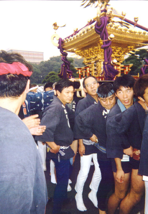| 【渡御風景】 渡御は両神輿とも整然と行われました。山王さんの神輿は、檜物町の白半 纏、九段下の紺半纏、本三の緑半纏、八丁堀の紺半纏が、前後、左右の棒を四 つにわけて時計周りに整然と交代しながら担いでいく渡御でした。また神田神 社のほうも背中に奉祝の文字が入ったそろいの白半纏、しかもその色が何色か に染め分けられ、指示に従って順次交代して担いでいく決まりのようでした。 まあ万一揉めたら機動隊が「たっくさん」待機しているんですからめったな事 は出来ませんが。 渡御は皇居前通りを外堀通り交差点を出発してと内堀通り交差点で折り返し て単純に二周して終了するというものでした。その間約2時間。3時に国立劇 場の式典が終わり、5時に「民間」の集会が始まるその間の時間で行われたパ レードの一環です。華やかな内堀通りの山車・民俗芸能パレードをオーロラビ ジョンを片目でにらみながら、神輿を担いだ渡御でした。 渡御を終えて八丁堀区民館に戻り、着替えてから町会のTさんから、 「奉祝 天皇陛下御即位十年 平成十一年十一月十二日」 「天下祭 日枝神社神田神社」の木札守りと 「十六弁の菊の御紋章と山王の文字」の入った記念手拭い を頂戴する事が出来ました。 あ〜 これで本当に 今年の神輿も終わりです。 はっちゃん QZM02610@nifty.ne.jp でした。 |
