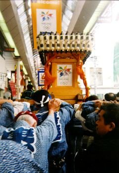 【五輪で神輿!】 この話を最初に聞いたのは、丁度一年前の福島の祭に行ったときでした。祭 り仲間の知人に始めて紹介されたKさんの名刺に「長野五輪に神輿を出す会」 の副会長とあったからです。その節は是非とのご挨拶でお別れしました。その 後9月に幡ヶ谷の祭で、再度Kさんにお目にかかったときには、話が本格的に なっていて、しかも、「武野會」のM会長とKさんは旧知の間柄だったので す。いや〜世間は狭いものです。 と言うことで我々「祭道・武野會・関東百人睦」の仲間達は、武野會を代表 会にして、そのほかにもいつも一緒に担いでいる会のメンバーも併せ50人乗り のバスで補助席まで総動員して長野へいく事になりました。 2月15日朝5時に西武新宿線線田無駅を出発したバスは、朝6時に東久留米 駅ではっちゃん達池袋線組みと合流、雪の中を長野へ向けて出発しました。関 越道、長野道は雪のせいもあって渋滞。長野市一番の繁華街 権堂へ着いたの は11時半でした。 【五基の神輿を】 着替えをすませてアーケードを入っていくと権堂の中心にある秋葉神社から 神輿が出るところでした。 「あれ?変ですね。神輿が出るのは1時と聞いたのにまだ12時ですよ!」話 を聞いて見ると、今出るのは今回の「神輿ボランティア」の中心になって話を 進めて下さった「善睦」さんの万燈神輿で、我々が担ぐ神輿は別の所から出発 して、合流するのだそうです。 近くに貼ってあったカラーコピーの手作りポスターには Welcome to NAGANO THE1000人みこし! 1998年2月15日(日) 秋葉神社 12:00出発 権堂アーケード〜中央通り(新田町〜大門南) 五輪にちなんで5基の神輿(NAOC文化ボランティア登録8002号) 信州神輿保存会 善 睦 連絡先 ◯◯◯ Tel◯◯◯◯ とありました。 善睦さんの万燈神輿は、前が善睦さんの紋が入り、後ろは長野五輪のマーク が入った絵入の神輿です。モダンな長野五輪のマークが白木の枠に艶やかに納 まっていました。 そのほかに上田や長野市内の神社の神輿が4基出ました。 【欅睦さんの神輿】 我々が担ぐ神輿は、小平の欅睦さんが運んだもので、大きさ3尺の手作りで 豪快な感じのする神輿です。6点棒で担いでいますから、大きすぎて権堂のア ーケードからは、出発できないので、中央通りから合流することになったので しょう。神輿の出発所にはKさんも、たすきを掛けてらっしゃいました。今回 のボランティア神輿の副会長ですから、気苦労も大変なものでしょう。 【中央通りの神輿渡御】 |