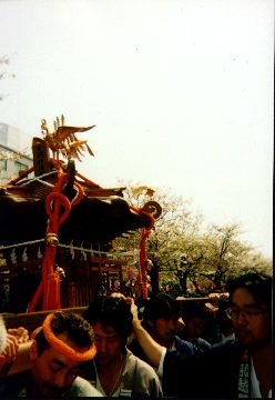 | 神輿は桜並木を進んでいきます。この一段高くなった道を「段葛(だんかず ら)」と言うんだそうですね。 途中から抜けて前のほうへ行って見ました。 五所和賀さんの神輿のすぐ前は、これも例年おなじみ、回転する山車です。 どこの山車かは見落としましたが、中に囃子方が乗っていて、要所要所で360 度ぐるっと廻ります。かなり早いスピードで、後ろに差した飾り花が大きく揺 らぎます。 さらにもう一つ前は、甘縄神明宮の神輿です。白木の4点棒平台の神輿で す。この神輿、割合すいています。しかも、去年いろいろお世話になった川崎 の会の人達が何人もいたので中へ入れてもらいました。実は、はっちゃんは2 週間前に指をちょいと切りまして抜糸前だったものですから、あまり激しい事 は避けたかったので、この位の混み方が丁度いいんです。入るにも抜けるにも 遠慮がいりませんから、マイペースで担げます。後で地図で調べたところでは、 甘縄神明宮は長谷観音の近くにある神社で、かなり広い敷地の神社でした。 渡御の途中に、酒屋さんで缶ビールを買って、グッと一飲み。日陰はさほど でもないのですが、日向は暑いくらいの日でした。担いだ後は汗びっしょり。 乾いたのどにビールがしみます。これが楽しみで鎌倉まで遠征して来たんです から。 神輿を納めた後、鶴岡八幡宮を散歩します。 いくつかのグループが桜の木の下に陣取って、車座の宴会。神輿屋名物、 一升桝を担いでの「鉢洗い」もやっています。桜の木の下だと絵になります ね。草笛の会がいたり、外人さんも勿論いますね。あっ!新婚さんが人力車に 乗って記念撮影に来ました。近くの結婚式場から来たんでしょう。紋付き袴の 新郎と、白無垢の花嫁さん。みんなで、「おめでとう」と声をかけます。う〜 ん、鎌倉してる。 帰りのホリデー快速は相当混んでいましたが、早めに並んだおかげで、見ん な座ることが出来またまたビールで乾杯。曝睡状態で帰路についた久々の神輿 デーでした。 はっちゃん @NIIZA saitama QZM02610 でした。 |