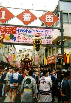 こんばんは はっちゃんです。 4月26日(日)に「赤羽馬鹿祭」で担いで来ました。 【馬鹿祭???】 この祭、地元商店街の「赤羽馬鹿祭実行委員会」の主催の観光祭で、第43回 にもなるのですが、なぜ「馬鹿」祭と呼ばれるんでしょうか。一昨年きたとき も、ことしもいろんな人に聞いたのですが、良くわかりません。 で、例によって実行委員会に電話で聞いて見ました。 はっちゃん「あの〜、なんで馬鹿祭というんでしょうか?」 係の人 「四月は馬鹿でしょ?」 はっちゃん「ええっ?」 係の人 「四月一日はエイプリルフールっていうじゃないですか」 はっちゃん「はぁ〜?!?」 係の人 「昔は四月の初めにあったんですよ。でも雨が多かったり、選挙と 重なったりで最近は4月の終り頃が多いですね。でも去年は雨で したけどね。でもとにかくずっと四月にやってきたんですよ。だ から四月馬鹿なんです。」 はっちゃん「はぁ〜」 4月1日以外の四月馬鹿は珍しいとは思うんですが、まあそれはともか く、「四月馬鹿」に「お祭り馬鹿」が集まる日だと思えばいいんでしょうネ。 それに各商店には「馬鹿安!」「バカ値」のビラがズラット貼ってありました し。 【馬鹿祭!?!】 神事に関係ない観光祭ですから、ミス◯◯の乗ったオープンカーを先頭に、 ブラスバンド、鼓笛隊やいろんな連中のパレードが続きます。鎌倉祭と感じが 似ていますね。駅前ロータリーのテントで開かれたカラオケ大会だって、予選 と決勝があるんですから、出場者も多いんでしょうね。 東京では今シーズン最初の本格的な神輿ですから、神輿協会のおえらがたを 始めいろんな会が、顔見せです。「ご無沙汰です。今年もよろしく。」はっち ゃんも去年お世話になったZさんやRさんにもご挨拶です。 地元の王子ささらばやしがいったあと、いよいよ神輿5基の出番です。狭い 商店街を大振りの神輿がいきます。はっちゃんたち「江戸 祭道」の仲間は一 番最後にあがった陣龍会さんの神輿に入ります。結構担ぎ屋が多いですね。か なりの激戦です。一つ前の神輿は結構すいているようなのですが、半纏が通っ ていないので担げません。もう一つ前の万燈は大丈夫なようですが。 【馬鹿祭!!!】 同好会毎に順番に、前棒をとっていきます。駅前ロータリーにかかったあた りで、「祭道」の番が廻ってきました。一番ギャラリーが多いところです。ラ ッキーですね。張り切って担ぎます。はっちゃんは、丁度みんながそろったあ たりで、棒から抜けて写真をとります。万一に備えて使い捨てカメラ専門で すからいつも、おんなじアングルですけどネ。 最近入会のうら若き「S嬢」もうすっかり会員のアイドルです。バトルの時 は、若い連中みんなでガードですからね〜。おかあさんも神輿のあとをそっと 付いていらしたようです。が、「御心配は御無用ですよ〜。彼女はもうすっか り、みんなの仲間です。でも親子で祭を楽しむためにいらっしゃるんでしたら 大歓迎ですヨ!」.........という訳でみんなの代弁です。 |