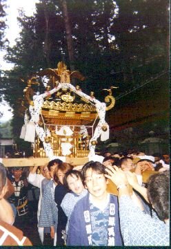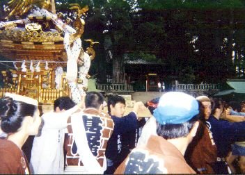 | 緑の日の4月29日(水)はっちゃんは日光へ行って来ました。日光で「天下 祭(てんかさい)」が行なわれ神輿が10基も出たんです。 【天下祭バスツアー】 「日光天下祭」は今年から始まった祭で、日光天下祭推進協議会が主催で、 日光観光協会が後援した祭です。2月に大島へ行ったときにも船内で神輿協会 から「4月29日に日光で神輿を出す」という案内がありました。 そして、「祭道」にも◯武バスから、天下祭バスツアーの案内が来ました。 でも、今年の暦では、以外とこの日は休みがとりにくい日なんですネ。結局 「祭道」でははっちゃんだけが参加。ZさんRさん達と一緒に「関東仲良し 會」主催のバスツアーで行く事にしました。 五反田駅前朝7時発。う〜ん。この時間でははっちゃんちは朝5時半位に出 ないと行けません。がんばって早起きして行って見ると、やはり◯武バスの観 光バスが、停車していました。 全員揃って定刻7時に出発。途中新橋でも10人位乗せて大型バスは完全に満 席。本日のツアー参加費4500円なり。 発車早々から、ビールが配られ、一升瓶が乱舞します。神輿ツアーお決まり の「朝から宴会」です。当然帰着まで続きますヨ。 【事前情報では......】 車内で見せてもらった渡御マップでは、二荒山神社から東照宮まで担ぐこと になっています。あれれっ!?!?どうも話が違います。 事前情報では、昼に日光駅前で担いで、午後から東照宮の参道で担ぐという 話だったのですが......。募集チラシには平成11年の日光の世界文化遺産登録 を目指して、「天下祭」で多いに日光を宣伝する旨も書いてありましたし..。 うわさでは来年、一億五千万円の神輿が出来上がりそれを奉納して本格的に祭 をやるための準備とも聞いていたのですが...。 結局、車内であった案内では、「日光駅前、東照宮表参道では、警察の許可 が降りなくて、担ぐことが出来ない。今年は、二荒山神社から、東照宮五重の 塔迄担ぎ神事の後、旧社務所迄行く。」との事でした。 【日光ブラブラ・ケッコウでした】 日光市内へ入り、神橋の交差点についたのが11時。日光駅前で、12時から担 ぐには丁度ピッタリの到着時刻だったんですが....。 なんせ、3時間強も時間が開いてしまいました。新緑の日光を歩きながら、 まずは食事。せっかく日光へ来たのですから、「ゆば」を食べたいと言うこと で、「山菜ゆばそば」とビール(^_^)/ 二荒山神社に勢揃いした神輿を眺めてもまだまだ時間が余ります。 ブラブラ歩いて東照宮へ。今日は半纏を着ていると境内はフリーパス。陽明 門の魔除けの逆柱探し。神厩では三猿の謂れを一つ一つ確かめながら白い神馬 がこっちを向くまでじっくり待ちます。眠り猫の眼が一瞬でもまばたきしない かとニラメッコ(結構バカデスネ〜)したあと、奥の院の家康廟まで階段 207 段登り詰め。始めて青銅作りの家康廟を見ました。 とにかく、観光バスではあわただしく通り過ぎる東照宮境内も、今日ばっか りは、ユルユルと見て廻ることが出来ました。 【集合時間になって】 2時過ぎに、二荒山神社境内の神輿のところに戻ります。本日の神輿は 魁 日本神輿協会 栃木支部 二番 輿輝連合 幻龍会 三番 埼輿連 八坂睦 四番 藤沢 甚隆睦 五番 横浜 京浜連合 六番 彩心連合 七番 北領睦 八番 神輿会 雅連 九番 ふくろまつり 殿 藤沢 信友睦 の十基でした。(各々の神輿の堤灯又は駒札の表示によります。) ようやく2時半廻って、実行委員会から挨拶があり、各神輿の警備責任者が 紹介され、渡御の注意が入念に繰り返されました。「神輿渡御は三、三、四の 梯団に分かれて進む。神輿には御霊を入れて担ぐので、大人、子供を問わず絶 対に乗せてはならない。etc.etc.ともかく、絶対、ぜったい、ゼッッタ〜イ禁 止、なんでも『揉め事』禁止、禁止」どうもこれが今回の、予定急変のすべて のようですね。 東照宮五重の塔前に貼ってあった天下祭ポスターは -------------------------------------------------------------------- 四月二十九日(祝) 日光天下祭 てんかさい 江戸の祭が日光にやってくる ◆神輿10基・木遣り・纏ぶり・梯子乗り 十二時 日光駅構内 十四時 日光郷土センター敷地内 十五時 東照宮 二荒山神社境内(神輿渡御) -------------------------------------------------------------------- と、書いてあります。 入念に準備され、名前入の半纏や手拭まで売っている祭にしては、ザラ紙に 単色刷りのポスターはいかにも急ごしらえ。ギリギリ迄関係方面と折衝を続け た結果の、予定の急変を物語っていました。 この辺りの警察では「祭の警備」に慣れていないので「江戸から祭がやって くる!」即ち「喧嘩が集団でおしかけてくる!」になっちゃうのかな〜。 【江戸から祭がやってきた!】 3時過ぎから二荒山神社境内で神事が始まり神輿に御霊が入ります。 続いて、江戸消防記念会の梯子乗り。三人ほど乗りましたが、皆見事な腕前 でした。 そして、3時20分頃第一梯団が出発。魁が五重の塔に着いたとの連絡が来た 3時45分頃漸く第二梯団の発