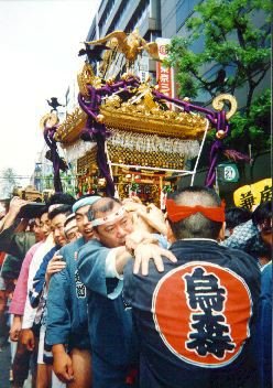 【宮出し】 神輿があがる時刻。お定まりの注意の頃からもう、あっちこっちで小競り合 い。いい場所を確保して置こうという連中がお互いに、バチバチ。それをやめ させようとする赤鉢巻がコラコラ。にぎやかなもんです。祭の興奮がイヨイヨ 高まりますね。 境内が非常に狭く、参道も幅2メートル位で両側にぎっしり飲み屋が建て込 んでいる烏森神社では、普通の形での宮出しをすることが出来ません。そのた め駅前の「ニュー新橋ビル」を一周することが、宮出しとなっています。 神輿が上がって、わあっ〜。それっ〜。でも大勢で一斉に取りついた割に は、きれいにあがりました。快調に大神輿が渡御していきます。 烏森神社の神輿は台輪の大きさ四尺二寸(宮神輿名鑑による)の大神輿です が、なんといっても一番の特徴は、屋根の形が入母屋を二つ重ね合せた「八棟 造り」であることと、小鳥が神社に因んで「烏」であることでしょう。きちん と揺珞をつけて、こよりのように繊細な締め縄をつけた手入れの行き届いた、 神輿です。 はっちゃんは、今回長野以来のまつきちさんといっしょに神輿のあとをつい ていきます。「あっ ありました。」前回もそうだったのですが、この位のバ トル神輿となると、必ず、鉢巻を落とす奴がいるんですね。今回もしっかり、 一本拾いました。但し、3本に裂いた真ん中の一本ですが。でも、真ん中です から、「烏森神社」の文字はきれいに入っています。「さあ、行くぞ。」神輿 の棒に突っ込みます。う〜ん。無茶苦茶のおしくらまんじゅうですが、なんと か一人抜けたすきに肩を入れることが出来ました。やっぱり、これが神輿の醍 醐味ですね。 一汗かいて、廻りをみます。なんとかみんな、はいれたようです。一周して きて木が入る頃には、メンバーの上気しながらも、満足そうな顔がならびまし た。S嬢や、今回神輿初デビューのM君もなんとか入れたようですし。 |