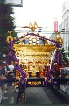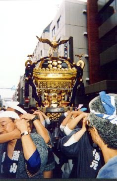 【本社の梯子】 例年は、鳥越と一週ずれる蔵前の第六天榊神社なんですけど、今年は鳥越が 6月1週になったおかげで、重なってしまいました。しかも、今年は隔年の本 祭で、本社神輿が出る年なんです。 幸い鳥越と第六天は目と鼻の先、歩いていける距離。梯子で担ぎます。 おお!?武野會のメンバーがたくさんいますね。彼等は朝からこちらに来てい るようです。 10時半廻った頃に、浅草橋の駅前通りにいる本社神輿に追い付きました。去 年は町会の連合で担いだところです。前は担ぎ手がきっちり入っていますが、 後ろは結構あいています。んでもって後ろに入りました。右肩が特に空いてい たので、いつもの逆の右肩に入ったのですが、いや〜重いのなんの。腰を痛め そうなくらいの重さでした。 【宮元町会の本社神輿】 しばらくして宮元町会に神輿が渡りました。さすが宮元。ここはかなり担ぎ 手がいます。他の町会と違って「祭道」の半纏では通らないので黒字に宮元と 染め抜かれた半纏を上から重ねます。 おおきさ4尺2寸の神輿。実はこのレポートを書くために神輿の大きさを確 かめたのですが、鳥越より一寸小さいだけなんですね。でも見た感じは鳥越が 二廻り以上大きく感じます。三社なんかは第六天よりずっと小さいにもかかわ らず、大きく感じますし。神輿の大きさは実際に物指しをあてての大きさのほ かに、雰囲気に拠っての「感じる大きさ」があるのかもしれませんネ。 といっても、二年に一辺の4尺2寸の大神輿。揺れる揺珞の音を響かせなが ら渡御を続けていきます。宮元町会の持ち時間は約90分。神社の鳥居の前で神 輿を高く挿したあと、次の町会に渡しました。 昼食後は祭道の仲間は、鳥越の鳥一町会、二丁町町会組みと、第六天の宮元 町会組の二手に分かれて、夕方迄担ぎました。 |