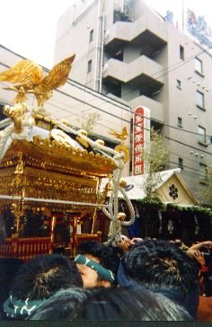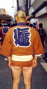 【宵宮】 鳥越の祭の宵宮は町会神輿の連合渡御、鳥越18町会(実際は22町会ある ようですが....)が三つに分かれて渡御をするんです。 今年も祭道会員Nさんのマンションに御邪魔します。Nさんは町内にすんで いる神社の氏子なので、半纏を用意してもらったり、着替えさせてもらった り、その他もろもろで毎年大変なお世話をしてもらっているんです。夕方5時 過ぎ、三筋北町会の茶色の半纏に身を固めて、神酒所に急ぎます。丁度神輿が 上がったところでした。 台輪の大きさ約2尺3寸、延べ屋根、平屋台、夜祭らしく葺返しに堤灯を一 杯飾った神輿です。しばらく町会を渡御したあと、連合の集合場所へ急ぎま す。 【担ぎ手様々】 おや?髪に「寿」の文字をカットにしたお兄さんがいます。寿町一丁目あた りを渡御したときには、ギャラリーに大受けでした。「あら、すてき おめで たい髪型ネ」すかさず「頭の中身もおめでたいですから」と横からペンギン君 の鋭い突っ込み。(そういうペンギン君の髪も十分めでたい黄金色ですけど ネ。)寿君耳まで真っ赤にして照れています。祭好きの美容師さんにやっても らったんだそうです。せっかくやってもらったんだから、受けてよかったネ。 寿君! 今回は、はっちゃんの仕事上の知り合いK嬢が始めて参加しました。三社祭 を見て、どうしても、神輿を担ぎたくなったということでした。S嬢にいろい ろ支度を助けてもらい、喜び勇んで、初デビュー。最初はおっかなびっくりで 顔がこわばっていましたが、2、3回棒につくうちに、いつもの明るい笑顔が 戻って来ました。 後日談ですけどね、月曜朝に、K嬢に「土曜日はご苦労さん、楽しかっ た?」と肩を軽くたたいたら、「すごく楽しかったです」と大声で悲鳴をあげ ていました。これってセクハラなんでしょうかネ(^_^)/ 6時半過ぎに連合渡御が出発。三筋北町会は後ろから3番目でした。さらに 7時半からは堤灯に灯が入り、いよいよ鳥越の夜祭本領発揮。神輿の担ぎに連 れて堤灯が揺れます。 堤灯を見ていると、担ぎ方のうまい、下手がよく判るもんですね。ある町会 は神輿が小刻みに上下するきれいな担ぎですし、またある町会の神輿は、堤灯 が左右にゆさゆさ揺れています。左右があってない証拠ですね。これでは担ぐ ほうも辛いし、神輿も痛みます。神輿がよたよた、まっすぐ前へ進みません。 連合を流れ解散して、町会に戻って来たのは、8時半を廻った頃でした。 【整列】 朝8時過ぎ、三筋北町会の茶色の半纏を来た担ぎ手が8列縦隊に並んでいま す。三筋北町会に本社神輿が来る時刻は9時丁度ですからまだ1時間もあるの ですが、列の長さはどんどん長くなっています。1列50人としたって、総勢 400人。 実際にはそんなもんじゃありません。もっとずっと長い列です。いかに大き な鳥越の本社神輿とはいえ、棒につくには激戦です。同時に100人はつけない でしょうから。そして三筋北町会の持ち時間はたった25分なんです。 さっきから何回も大きな説明書きを前にして、町会役員さんが担ぎ手に説明 しています。縦の列は、一列毎に担ぐ場所が決められています。歩道側から 1、2、3列は右の添え棒の前、中、後。そして、6、7、8列が左の添え棒 の後、中、前。これらは、各々1〜2組の同好会に割り振られています。そし て真ん中の4列目と5列目がはっちゃんたちのいる町会の列で、左右の台棒が 指定されています。もめないように、なるべく公平に担げるように、工夫して るんでしょうね。 【本社神輿を】 みんなの目がだんだん吊上がってくるうちに、鐘、太鼓の音が聞こえ、幟が 近づき、猿田彦が通り過ぎていきます。すぐ目の前に台輪の大きさ4尺3寸の 平屋台の大神輿が近づいてきてゆったりと留りました。これほど大きな神輿に なると、小刻みな揺れ方もしないんですね。 三桂町会から、神輿が引き渡され、三筋北町会の担ぎ手が神輿に取りつきま す。みんな足早ではあるものの、走らず、整然と決められた位置に取りついた 様です。去年は結構みんな走りましたから、今年は町会さんの作戦が効を奏し たんでしょう。 神輿が上がります。祭道の連中は台棒ですから、神輿の脚を抜いてからでな いと取りつけません。しばらくの待ちをおいて、順番に棒に入ります。はっち ゃんも、世話役の指示で棒に入りました。息も出来ない位の力です。なんとか 人と人のあいだに肩を滑り込ませてもらいました。 抜けたあとは激戦区の前棒をさけ、後の台棒に入れてもらいました。後ろも 大変な人ですが、順番待ちの位置に待機するのが、前よりずっと楽ですから。 あっというまの25分が過ぎ、神輿は次のあざやかな青半纏の阿部川町に渡っ ていきました。 そしてはっちゃんたちはNさんのマンションでしばらく休憩。次の行動に移 りました。 |