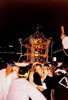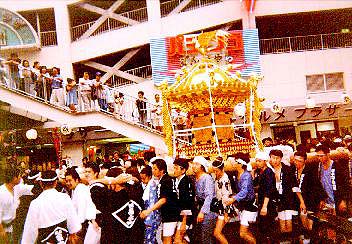 | 【平成10年大宮夏祭】 午後5時の約束で4時半に大宮駅に着いたはっちゃんですが、いや〜、びっ くりしました。駅の雰囲気が祭一色なんです。 そして、西口に出て見ると、駅からソニックシティに至る、あの大きなペデ ストリアンデッキがもう人でぎっしりになっていました。 駅でもらったパンフレットに目を通します。 7月30日(木)第18回 大宮花火大会 大和田公園周辺 19:00〜21:00 7月31日(金)西口神輿前夜祭 大宮駅西口周辺 17:00〜21:00 8月1日(土)第11回 スパークカーニバル 大宮駅西口周辺 17:00〜22:00 8月1日(土)'98中山道まつり「神輿・山車」 大宮駅東口周辺 17:00〜22:00 8月2日(日)'98中山道まつり「神輿・山車 民謡パレード・阿波おどり」 大宮駅東口周辺 17:00〜21:00 8月6〜7日(木金)第27回大宮日進七夕まつり 日進駅前通り周辺15:00〜21:30 いや〜すごいですね。この地の一の宮の大宮氷川神社の大祭にあわせて(便 乗して)観光まつりを行なっているんですネ。大宮の氷川様は曜日にかかわら ず8月2日が大祭ですから、この大宮まつりも年によって曜日が変わるんで す。とくに今年は土日と重なりますから、相等熱くなっているんでしょう。東 口の「高島屋、中山道の老舗商店街」VS 西口の「ダイエー、そごう、丸井、 駅前新興商店街」の対決の構図と言った感じです。 【スパークカーニバル】 珍しい名前の祭ですが、大宮西口の大通り三橋中央通りで、神輿の連合渡御 と、反対側から出発したサンバパレードが途中ですれ違ってスパークすると言 うのが由来だそうです。「これがお祭りルネッサンスだ。」とありました。 5時にダイエー前を出た神輿は、工機部前通りからそごうの角を曲がり、丸 井の角で夕食大休止に入ります。sato310さんにダイエー前で会ったはっちゃ んはしばらく神輿の脇を歩いていましたが、大休止のあいだに支度をして、駅 前バスターミナルあたりから神輿に付かせてもらいました。 最初の内は、sato310さんと廻し半纏で交互に入っていましたが、暑いの で、半纏を脱いで腰に巻く連中が多いのと、暗くなって半纏の有無が目立たな くなったことも相成って、青色ダボ上下のsato310さんは半纏なしで、白ダボ シャツに締め込みのはっちゃんが、腰に半纏を巻くだけで神輿に付くことが出 来ました。 |
