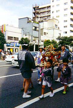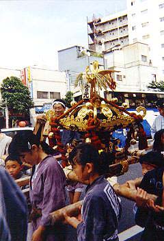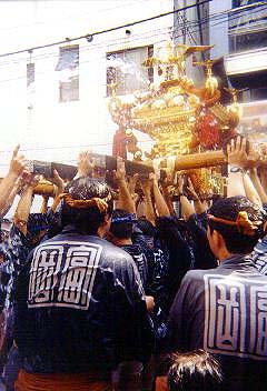 宮元町会中神輿 唐破風屋根。本格的な神輿。大きさ1尺5寸位。これだっ たら、大人が担いでもおかしくないですね。小学生、中学生位が担いでいま す。本来なら中高生位に担いでほしいのでしょうが。 宮元町会大神輿 延べ屋根。平屋台。大きさ2尺5寸。水掛けまつりの神輿 にもかかわらず、総漆塗りの神輿。胴も全面が金箔貼りの彫刻で、飾られてい ました。後で、渡御の時に町会の人が言ってました。「塗りの神輿は、乾かす のが大変なんだよネ。それと、かならずなんかなくなったり壊れたりしてるか ら、修理費が嵩むし。」 二の宮 神輿蔵の中に飾ってありました。総金箔貼りの大神輿大きさ4尺5 寸。二重台輪で担ぎ棒を通す台輪は4尺7寸だそうです。(宮神輿名鑑より) 6点棒でかつぐ神輿です。去年御披露目だったようですが、次はいつ担ぐんで しょうか?再来年を「御本社祭」と言うことにして出すんでしょうね。 一の宮 二の宮のとなりに飾ってありました。大きさ5尺だそうですが、二 の宮と比べると、一割り程度の違いじゃないですね。(もちろん単純に一辺が 一割り大きくなるだけで、体積では1.33倍になってしまうんですけどね)高さ が高いんです。重心が高いからうんと担ぎにくいんでしょうね。やはり、一度 担いだだけであとは出ていないというのも、解る様な気がしますね。10億の神 輿だそうですけど台車の上に載っていました。鳳輦になっちゃうんですかね? 続いて、境内での奉納剣道大会をちょっと見ます。剣道は全くやったことが ないはっちゃんですが、炎天下でやる試合は大変な体力がいるんでしょうね。 防具をつけての試合は、見ているだけで熱が出てきそうです。水掛けまつりで は、暑いほうが歓迎ですが、剣道をやるほうとしては薄曇り位がいいんじゃな いでしょうか。 【宮元町会】 午後2時半。神輿の出る時間になって、最初に行ったのが、富岡一丁目・宮 元町会です。 宮元町会に行ったのは「祭道」のI氏、Y氏、T君とはっちゃんの4人。こ のうちI氏Y氏が町会の半纏を持っているので、二人が神輿から抜けていると きに、T君とはっちゃんが半纏を借りて神輿につく段取りです。もちろん、町 会半纏を着ていないものは、一切神輿につけない決まりだからですね。なん せ、子供神輿でもきちんと宮元の半纏を着ていますから。 さっき、境内で見た神輿が、永代通りの鳥居前に据えてあります。 一本手拍子を打って、神輿が上がります。一旦神輿を下げてすぐ差しあげ て、それから担ぎはじめる、独特の担ぎです。「ソーラ、ソレ、ソレ、差せ、 差せ、差せ.....(直って)わっしょい、わっしょい」残念ながら舞い上げは ありませんでしたが。 すぐさまホースでバケツで水が飛んできます。「アッ冷たい。でも気持ちい い。」かつぎと掛け声はもちろん深川流の「わっしょい」です。 半纏・担ぎ方等の決まりが厳しい深川でも、宮元は特に決まりが厳しいほう で、したくも厳しく決められています。半纏の下は、晒の胴巻きまたは白の鯉 口シャツ。色もの厳禁。そして、白半ダコ(半股引)もしくは白パンツで、長 い股引き及び、ふんどし厳禁です。正直この締め込み禁止には参りました。足 が非常に窮屈で動かしにくいし、暑苦しい。やっぱり、神輿にはふんどしです ね。 |