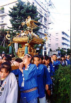 いいかげんでき上がった頃に集合時間。午後二時神輿の出達です。 この町会は残念ながら神輿をもっていません。神輿師 十三代目南部屋五郎 エ門師からのレンタル神輿です。でも、写真で見た限りは、去年と全く同じ神 輿のようですが。 左肩一本「祭道」に任されていますので気を抜く訳には参りません。みんな で交代しながら、入って行きます。神輿を担ぎながら街を見て行くと、一年前 のことが結構しっかり思い出されてくるものですね。一年間全く来たことがな いんですが。「あっこの家覚えている。おもしろいデザインだもんな。あっそ うだ、去年ここで、抜けてビール買ったんだ。etc.etc.」 渡御の道中、駒繋神社のすぐ脇で神輿が休憩します。もうほんのちょっと神 輿が進めば、神社の鳥居前迄行く事が出来るんですけれど。せめて、鳥居前で 神輿を差し上げることぐらいしたいもんですね。祭道だけで勝手に神輿を持っ て行く訳にも参りませんが。 神輿の休憩中、N代行に神社の境内を案内してもらいました。小高い山にな った境内には屋台が沢山ならんでいますが、その裏にちゃんと神輿が本殿まで 行けるように参道が作ってありました。 本殿の脇に神輿蔵があって、昭和11年浅草宮本作の、2尺6寸延べ屋根の端 正な神輿が飾ってありました。この神輿が、参道を行き来して宮出しをするん でしょうね。でもこの神輿の出るのは不定期で、次回の予定もはっきりしてい ないそうです。 あちこちで、休憩・接待を受けながら、神酒所へ戻って来たのは夕方6時 頃。最後には恒例裸男も飛び出しての、担ぎ納めでした。 はっちゃん @NIIZA saitama QZM02610 でした。 |