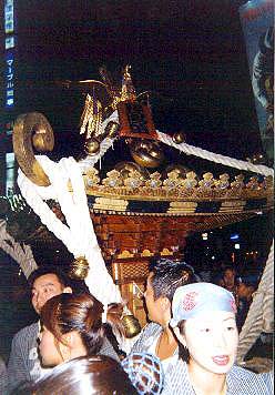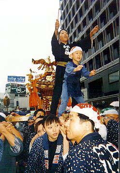 午後1時、昼の連合渡御が始まります。池袋西口ロータリーにならんだ神輿 が、一斉にに拍子木の合図の基、動きはじめます。あちこちの神輿に見た顔が 取りついています。T会H会K会みんな来てました。大繁華街の大きな祭です からね。 「池三睦」の神輿はロータリーの駅の反対側から出発したのですが、ロータ リーの中央が祭典本部になっています。お囃子の屋台、おえらがたのテント等 がならび、両脇はTデパートMデパートとBカメラの大きな広告塔を兼ねたま つりのアーチになっていました。確かにT・Mデパートも池袋の顔ですが、B カメラもすっかり池袋の顔ですもんね。 「池三睦」の神輿は二人の兄弟が神輿に載って調子をとってくれます。お兄 ちゃんは、小学2年生位、弟君は年長組位でしょうか。良く似た丸顔が二つな らんでいます。本部前で神輿を差した後、連合は流れ解散。神輿は各々の町会 へ戻っていきます。池三睦も、町会へ戻りもう一周町内を渡御した後、無事神 酒所入り。今年の御獄神社の大祭は終了。うれしい納会に入りました。 |