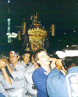 【夜のまつり】 Iさんの家でしばらく時間をすごさせてもらった我々は、また池袋西口ロー タリーに向かいます。午後6時からまた神輿の連合渡御が行なわれるんです。 夜の渡御は、神輿の数は14〜5基と少ないのですが、全部同好会の神輿。ど ちらかといえばパレードの雰囲気が漂います。沢山のギャラリーの中で、同好 会の担ぎが続きます。 「祭道」は「粋鳳輦」さんの神輿につきます。「粋鳳輦」さんの神輿は台輪 で2尺3寸くらいの延べ屋根素木作りの神輿です。ちょっと変わった感じがす るのは、と囲垣や階段等の飾りが一切無いことです。台輪の平場が非常に広く みえます。ちょうど浅草神社(三社祭)の神輿が渡御の時に、囲垣、鳥居等を すべてはずしてしまうのに似ていますね。 同好会の神輿ですから、一触即発、バトル含みの担ぎです。もちろん和気藹 々の中、仲間通しのじゃれっこなのですが、はた眼にはなかなか迫力があるよ うです。本部テントに来た時には「粋鳳輦さんの神輿、あんまりもめないよう に」なんて放送があったくらいですから。 他の神輿も見てみます。日暮里の睦は、素盞雄神社流の二天棒で大きく神輿 を左右に振る「神輿振り」です。以前から話には聞いていましたが、実際みた のは始めてです。なれないとかなり危険な担ぎですね。 豊島青年会議所の主催の「国際交流神輿」もありました。日本に学ぶ留学生 達でしょうか。国際色豊かな神輿がありました。同好会は入っていないよう で、「Wa_ssyo_i!ワッショイ!」いかにも素人っぽい担ぎでした。 途中休憩を挟んで2時間、ロータリーを3周位したところで、「第31回ふく ろ祭」の夜の神輿渡御は無事終了しました。雨模様でしたが、大した振りにも ならない、まあまあの日でした。今年は雨が多いですから、この程度なら良し とせねばならないんでしょうネ。 はっちゃん @NIIZA saitama QZM02610 でした。 |