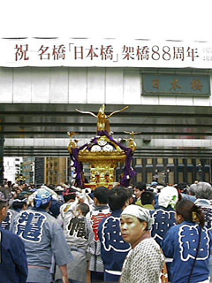 神輿は午後1時千疋屋前から出発。三越を通り、日本橋を渡り、閉店した東 急百貨店を通過。高島屋前を通り京橋の手前で折り返します。 日本橋を渡る時、担ぎ手は神輿に取り付こうと神輿に殺到。はっちゃんはな んとかがんばって取り付く事が出来ました。 「日本橋東急」前を通過する時は去年の日枝神社大祭の時を思い出しまし た。華やかに飾っていた店が、今日は祭りの日もにシャッターをおろしたま ま。いやはやなんとも.......。 ちょっと高島屋の店内にも入ってみたのですが、正面ホールに「檜物町」の 神輿をかざって「なぎらけんいち」下町トークショーが行われていました。 【400年の禁をやぶって】 道中で地元の半纏の人に聞いたところ、「室一」と「日本一」は日本橋を挟 む両方の町会なんですが、「室一」は神田明神、「日本一」は日枝神社の氏子 なので、通例はどちらの神輿も、橋の真ん中で折り返し渡り切る事はないのだ そうです。「今回は400年の禁をやぶって渡ったんだよ。」と言っていまし た。なるほどそれで、朝の神事も祝詞が2回あったんですね。ちょっと不思議 な感じがしたんですけど。 今回の「三越」「高島屋」共初同企画が成功したのは、景気の悪さのせいか もしれませんが、なんとか一がんばり、景気が回復してからも、神輿が日本橋 を渡り切りたいとおもったのは、はっちゃんだけではないとおもうんですが。 はっちゃん @NIIZA saitama QZM02610 でした。 |