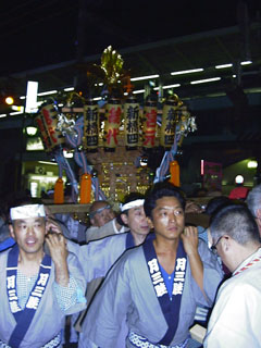 そしてはっちゃんはゴールデンウィークの尻尾のような5月7日の宵宮を担 がせてもらいました。会社から神酒所迄ゆっくり歩いて15分。金曜日のほうが よっぽど楽なんです。土曜日は仕事もありましたし。 一昨年の時は、はっちゃんの会社の連中やネットの祭り仲間と一緒に町会の 貸し半纏をかりたのですが、今年ははっちゃん一人だったので、祭道の半纏で 行きました。 担いだ神輿は新橋S月会さんの縁で新橋4丁目の神輿。神輿の軒提灯赤で「 宮元」とはいっていました。大きさは台輪で2尺強。唐破風屋根、二重勾欄、 四方階、白木の神輿です。五丁目も同じような感じの神輿です。作者も同じか も知れません。 渡御は2基連合で行われ、最初はまっすぐ新橋駅に向かい、新橋駅烏森口前 で、練った後町会へ戻ります。 新橋3丁目から6丁目あたりが氏子町会のようで、新橋飲み屋街のまっただ 中、一杯機嫌のサラリーマン諸氏が渡御を見守ります。一昨年の時もそうでし たが、好奇心旺盛な人が時々神輿に入ってきます。革靴、背広姿のままで。ま あ棒はあいてますし、この神輿は和気あいあいがモットーなので快く受け入れ ますが、周りの担ぎ手はにげます。だって、革靴で踏まれたらこちとら大変な んですから。酩酊紳士は重いのと息切れで、すぐ退散してくれますから、また 我々担ぎ手の世界に戻ります。今年は二基の神輿で3人位いました。 S月会のSさん、K睦のUさん、zmyさんたちとビール片手に歓談した、休 憩を挟んで、宵宮の渡御は通算2時間。また背広に着替えて通勤電車に乗った のは夜10少し前でした。 はっちゃん @NIIZA saitama QZM02610 でした。 |