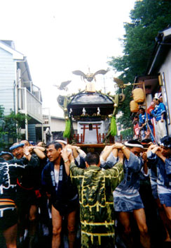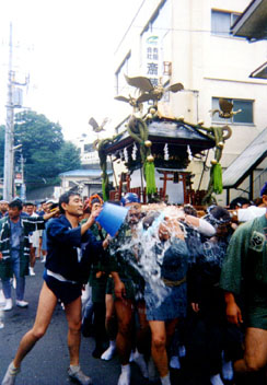 11時半集合で、渡御の安全を祈願する神事が始まります。 神輿の堂の戸が全部なくなっていて、お社の中が丸見えです。神輿の中に紙 で造った御幣が据えてありました。先程御霊移しの神事が行われていましたか ら、あの御幣が御神体なんでしょうか?神主さんの丁寧なお払いの後、玉串奉 典。氏子総代、各同好会長はもちろん、交通安全協会から、狭山警察署まで呼 ばれました。警察の玉串奉典は珍しいですね。担当の警官も初めてらしく、神 主さんに段取りを小声で教えてもらいながら無事神前に榊を奉納しました。 神事の後、閂かわりに神輿の堂にきっちりと晒を巻いて、いよいよ渡御開始 です。あれあれ?いつもはまっ先に一杯になる前棒ががらがらですね。そのわ けはすぐにわかります。神輿があがってすぐ八幡様の前で神輿を一差した後、 神輿は境内を出て行きます。ととたんにホースの水が飛んできます。オヤオヤ いつも端棒争いをしている連中が今日はホースの先端をにぎって水賭けごっこ ですね。参道をおりて、最初の町会の集会所に差し掛かった時には、もうバケ ツの水がバシャバシャ、ホースがジャンジャン。神輿に取り付いている連中は 頭から足袋迄びっしょりです。 渡御の沿道沿いの民家では、ホースを構え、バケツを持った氏子さんが待機 して、我々担ぎ手に頭から水をかけてくれます。それどころか、半纏を着た連 中が神輿の先回りして、沿道の民家を尋ね回って、水を所望してしている始 末。梅雨明け間近の曇天のこの日、神輿を担ぐには蒸し暑すぎる陽気。水をか ける方もかけられる方も、快適な一瞬なんです。 |