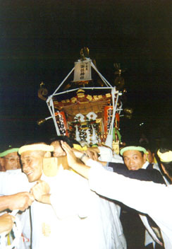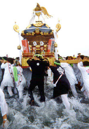 | 【香川諏訪神社境内で】 今年の香川諏訪神社の神輿の「おたち」は午前2時との事で、1時には身仕 度をして神社へ向かいます。浜降祭の仕度は保存会の人は背中に赤で五弁の柏 の葉と香川の文字の入った湘南流の白い長ダボ。それ以外の人は白の長ダボも しくは白シャツに白の股引と言った格好でした。足元は白地下足袋もしくはビ ーチサンダルといった所でしょうか。基本的には白であれば構わないようで す。それと大事なのは配られた黄色の鉢巻きをきちんとする事。鉢巻きの色に よって担ぐ神輿が決まっています。ちなみに後で連合渡御になった下寺尾諏訪 神社の鉢巻きは黄緑色でした。 保存会長や氏子会長の挨拶の後、香川諏訪神社の神輿のお発ちです。どっこ いどっこいのかけ声とともに箪笥の音が鳴り響き神輿は境内を2〜3周したあ と急な階段を宮出しです。最初に2尺台輪の小神輿がおりたあと、3尺台輪の 大神輿がゆっくり階段をおります。小神輿は神社のすぐ近くの集会所迄大神輿 を先導します。 【暗闇の町の中を】 香川諏訪神社の神輿は真っ暗な中を香川の集落を抜けJR香川駅からの商店街 では下寺尾諏訪神社の神輿と環合、二基が前を行ったり後になったり並んだり と連合渡御を行います。沿道には近くの人たちが間夜中にもかかわらず神輿を 迎え拍手をしてくれます。 極楽寺睦の会長さんから、「二基の神輿は兄弟神輿だから連合の間はどっち を担いでもいい」との許可が出たのではっちゃんも両方の神輿に入ってみま す。あらかじめ聞いてはいましたが、なるほど、神輿によって担ぎ易さは相当 違う物です。香川の方は大きくて重心がやや上にあるようで、二点棒では左右 に揺れてかなり持ち重りがします。それにくらべて下寺尾の神輿はひとまわり 小振りですが、非常に担ぎやすい神輿でした。二点棒でしかも身体を棒の中に 入れる喧嘩担ぎですから、神輿を安定させるには、重心の位置が特に大切にな るようです。 子供を肩車した人が神輿の脇についています。神社の神輿ですから人は乗せ ませんが、子供を肩車して神輿の脇で一緒に調子をとる事で、子供は非常に喜 んで祭り気分になっているようです。地域に根付いた、次代の担い手の養成な のでしょう。保存会によっては、真夜中に子供神輿を連れてくるところもある んですから。 【暁の浜辺】 新湘南バイパスからバスに乗った担ぎ手は、浜辺の県営駐車場で、トラック で別送された神輿を受け取り、一気に浜辺へ担ぎはじめます。一昨年来た時 は、バスの中で少し休む時間があったのですが、今年は、着いてすぐ神輿を担 ぎはじめます。国道を横切り、浜辺へでて、浜降祭宣伝部のテント前を通過し て葉のついたままの青竹で出来た一ノ鳥居をくぐります。ここからは神聖な神 の場所。もうこのあたりでは神輿は担ぎ手で一杯。とても棒に取り付けませ ん。はっちゃんも国道を横切ったあたりから棒に入って禊に備えています。 神輿はテント前の浜で2〜3回揉んだ後まっすぐに海に入ります。今年は、 遠くの台風で海がうねっているとかで、ほとんどひざくらい迄しか海に入りま せん。波打ち際ですからかえって、足をとられて担ぎにくいですね。 写真をとるために神輿を抜けます。神輿からほんの2〜3メートル沖から急 に深くなっていました。大平洋を背にしてカメラを構えます。(もちろん使い 捨てカメラですが)波のタイミングを見ながらカメラを構えるのですが、後ろ から波が襲ってきて一気に頭迄濡れてしまいました。波は相当荒いです。 香川の神輿はこの波と汐の禊のあと、同じ青竹の二の鳥居をくぐり祭場へ入 ります。今年は香川の神輿は順番が相当早かったようで、これから浜辺での祭 事終了迄ながいながい待ち時間がありました。 |