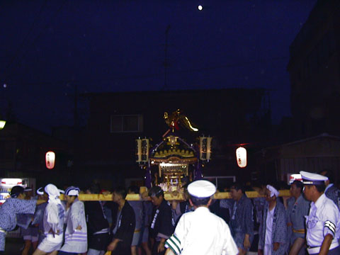 4時に第一回目の神輿があがります。 まだまだ日は高くちょっと担いだだけで汗びっしょり。小休止の時のレモン 水と梅干しがさわやかです。2回目の小休止の時の薬局提供スタミナドリン ク。口に入れる片端から汗になって消えて行きます。 台輪2尺6寸唐破風屋根の神輿は、去年担ぎ棒を新調しています。きれいな 白木はまだまだまっさら、さすがに香りはもうなくなっていましたが。 T字型に商店街を渡御して休憩。この日は自宅近くの祭りですから、「祭 道」のメンバーも子供連れがたくさん。N代行、H顧問のお孫さん、H君のお 嬢ちゃん。ベビーカーが3台も並ぶ賑やかさです。 お弁当とビールでゆっくり1時間を過ごした後、午後6時から二回目の渡御 が始まります。神輿の軒につけられたちょうちんに灯りがつけられ、いよいよ 祭り本番です。かなりあちこちから同好会があつまっていますね。本所のM 会、池袋のN会、T会、水海道のK会......。おっ最近新座で結成されたT会 仕度は黒上下で決めてますネ。 商店街の神輿ですから、わきあいあいとサービスがモットー。それなりの仕 度をした子供さんはどんどん神輿に乗せて行きます。神輿仕度、浴衣姿の子供 達たちが交替でのって行きます。中にはうまく調子がとれなくて船酔い状態に なる子や、びっくりして泣き出す子供もいますが、大半の子は楽しそうに調子 をとってのっています。 あたごの神輿は夜9時頃迄、商店街を渡御いたしました。 はっちゃん @NIIZA saitama QZM02610 でした。 |