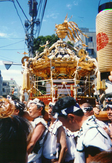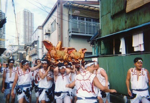 【8月7日(土)神輿勢揃い】 土曜日は睦神輿の連合渡御が行われます。住吉神社の祭りの場合、町会とよ ばずに「連睦」「単睦」という呼び方をしているようですね。 月島一之部の神酒所前で待つ一之部役員担ぎ手の前を二号地、晴海、四之 部、三之部、二之部各睦の神輿が順に渡御して行きます。大神輿だけの睦もあ れば、中神輿、子供神輿も一緒の睦もありました。神輿の通過を拍手で見送っ た後いよいよ一之部の神輿があがります。 月島一之部の神輿は漆塗り・小唐破風屋根・二重勾欄 台輪で二尺八寸の大 きさがありました。三味線台輪ですが戦前の神輿だそうで、行徳浅子周慶の銘 版がついています。額に入れた故人の写真を掲げて担ぐ人がいたのも、この祭 りの神輿の特徴です。故人は連睦総代の半纏を着ていましたから、生っ粋のお 祭り野郎なんでしょう。 新佃の神輿を後ろに従え、隊列は佃の旧町会に入っていきます。 ここでし ばらくの休憩の後、先頭に獅子頭が隊列に加わり、宮入となるのですが、はっ ちゃんは、仕事で来た会社の連中と落ち合い喫茶店でしばし談笑。 会社のみんなと別れて、西仲通を二号地の御旅所まで神輿を担ぎます。御旅 所前で連合睦の勢揃い三本締。倉庫街に担ぎ手の手拍子が鳴り響きました。 【8月8日(日)各部神輿町会巡行】 朝10時神酒所集合での神輿があがります。この日は祭道の仲間は新佃と一之 部に別れて参加。はっちゃんは昨日に引き続き一之部の神輿を担ぎます。一之 部、二之部というのは町名の月島一丁目、二町目とずれているんですね。清澄 通りをはさんで東西に細長い一画が一之部の町会なんだそうです。そのため各 部の神輿とも清澄通りを何度も横断。おかげでこのあたりの通りは大渋滞とな るわけですね。まあ3年に一度の事と勘弁してもらいましょう。来週の深川で は永代通りを完全に止めちゃうんですからそれよりはましでしょ。 佃の祭りも真夏の水掛け神輿。頭からホースでバケツで水がかけられます。 家中のバケツ、たらい、ベビーバスまで総動員で水を汲んでおいて、神輿のく るのを待っていてくれます。なかには汲み置いた時間が長過ぎて生ぬるくなっ た水があるのも御愛嬌。 昼食の休憩時間に、本社の八角神輿が西仲通を渡御して行きます。そろいの 浴衣をきた睦の連中が独特の担ぎ方でおごそかに渡御して行きました。昨日見 た獅子頭の渡御もそうでしたが、かけ声も「(わっ)しょい、(わっ)しょ い」で、昔ながらの津久田の伝統なんでしょう。 |