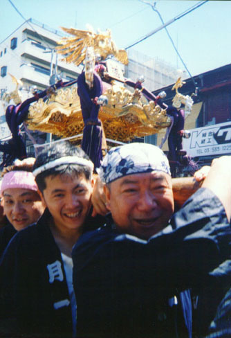 8月7、8日中央区佃島 住吉神社の3年に一度の大祭が行われました。 はっちゃんも行ってきましたので報告いたします。 前回(平成8年度大祭)は新佃睦にお邪魔したのですが、今回ははっちゃん の勤務先の関係で、連合睦会のS会長から一之部の半纏をお借りできたので、 今回は月島のメインストリート西仲通を渡御する一之部の睦にお邪魔いたしま した。 |