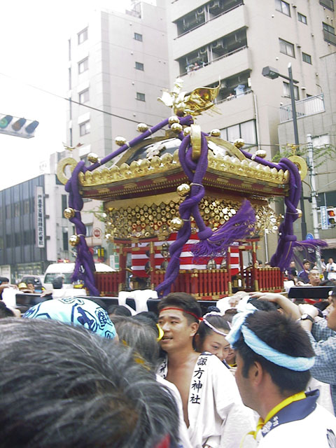 【本祭】 去年中央町会・西二町会と二ケ所の町会神輿を担いだ日暮里諏方神社の大祭 ですが、今年は3年毎の本祭り。本社神輿が出ると言う事で、朝早くから日暮 里に出かけました。 最初に西日暮里二丁目町会の神酒所へいって、祭道顧問のNさんから半纏と 鉢巻きをお借りします。白地に紺襟、背中に神社の紋が入った半纏でした。 仕度をしてまずは日暮里の駅前へ行きます。ちょうど本社神輿が駅前のロー タリーに差し掛かったところでした。 本社神輿は4尺3寸の大神輿。2点棒との話も聞きましたが4点棒で担いで いました。う〜ん、大きい。鳥越と同じ位です。この位大きくなるとしずしず と進んで行く感じです。すっきりとした延べ屋根。瓔珞をつけて、堂は紅白の 晒で巻いてありました。台輪もすっきりと直角になっている古式ゆかしい神輿 です。半纏の襟は「西二」と入っていて、入っちゃいけないのかもしれません が、後ろに入れてもらいました。後で聞くとちょうどその頃sato310さんが前 にいたんだそうですね。惜しくもすれ違いです。 切り上げて西二の集合場所に移動。神輿が中央町会から西二町会に引き継が れてからは大手を振って担げます。もっぱら前棒と横棒に入っていました。充 分担いで、西二の時間が終わりかけた頃中央町会のKさんにもお会いできまし た。Kさんは「特任警備」の赤腕章。御苦労様です。 本社神輿は、これから台車移動暫くいってからまた担ぎ出すんだそうです。 御朱引図を見た感じでは、午前中が山手線の外側。午後から山手線の内側を担 ぎと台車半々くらいで渡御するようですね。昔は2点棒で担いでいたそうです が、今では4点棒になったので狭い通りは担げなくなったのかも知れません。 はっちゃんは見る事が出来ませんでしたが、2点棒から4点棒にすぐに変えら れる特別な工夫がしてあるんだそうです。 |