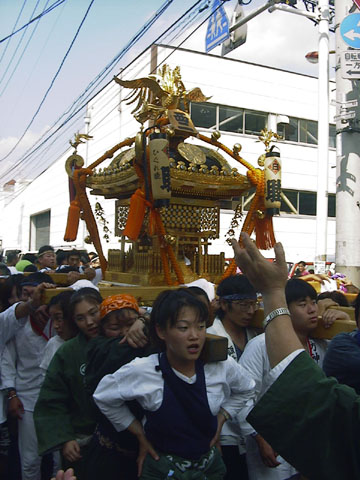 ひと休みした後「西二町会」の神輿を担ぎます。去年も担いだ白木の神輿が かなり狭い路地まで丁寧に渡御して行きます。神輿のHPでお馴染みのzmyさん も同じ町会を担いでいました。今月これで十何ケ所目だそうで、相変わらず凄 いペースですネ。 昼食後暫く担いで西二名物レディス神輿が始まる直前に、祭道の多摩グルー プは西二町会を失礼させてもらいました。 --------------------------------------------------------------------- その後 sato310さんより 以下のコメントをいただきました。 朝一番に神社から駅前に下ろしてきたのを見たのですが、 なんと 本棒・添え棒と横棒とのつなぎを、U字型の鉄棒と鉄板を使い、 ボルト締めしていました。その上からさらしを巻いているのですが、 丁度そこに当たるとかなり痛いそうです。 この日の夜の宮入は大雨の中、かなり大変だったようです。(Kさん談) ちなみにこの本祭の宮入は、狭い参道を2点棒に変え、 各町会の警備の半纏だけで担いでいきます。 3年後は、中央町会が夕方になるので、宮入も楽しみにしています。 --------------------------------------------------------------------- はっちゃん QZM02610@nifty.ne.jp でした。 |