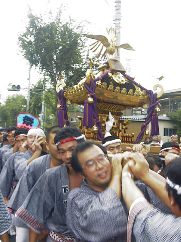 引き続き8月29日の神輿です。 日暮里から取って返したはっちゃん達が、都下清瀬市の志木街道に着いたの は、4時半頃だったでしょうか?午後2時に出た神輿は丁度折り返し点にか かった所でした。 延屋根、勾欄造り台輪2尺3寸の黄金の神輿が、大太鼓と女性の担ぐ小神輿 を先達にして志木街道を渡御して行きます。ここの神輿は休憩が多く、少ない 担ぎ手でゆっくりすすんで行きます。 半纏は下清戸の伊勢八雲会と上清戸の平心講と2種類だけがとおります。基 本的には町会だけで町会だけで担ぎ、5月に行われる平心講の神輿も同じよう な運営になっています。同好会は祭道しか来ていません。 最後の休憩にかかったあたりから突然雨が降ってきました。早めに神輿を出 しましたが、宮入の頃にはシャワー以上の豪雨になってしまいました。締め込 みまでぐっしょり。宮入をすませると、直会も失礼して自転車で一目散。家に 帰って風呂に飛び込みました。 結局今年の8月は大泉、佃、虎の門、深川、高田馬場、日暮里、上清戸と7ケ 所行きましたが、濡れずに済んだのは大泉と日暮里だけでした。(それ以外は 雨か水かけ神輿)今年の8月は雨が多かったですね。 はっちゃん QZM02610@nifty.ne.jp でした。 |