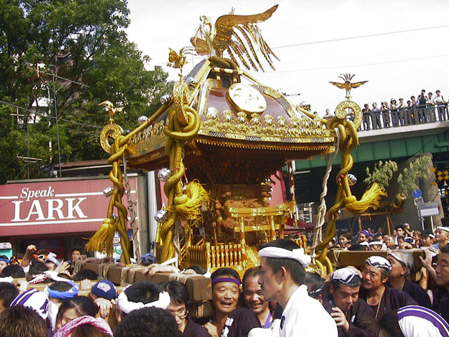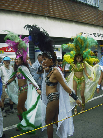 おや?今年は公園脇の休憩が長いですね。むむ?サンバパレードをやって る。今年は、2丁目の商店街が神輿の他にサンバパレードも呼んだようで、日 伯合同、男女混成8人位の踊子とドラムのパレードでした。小麦色の裸に羽飾 りをつけて踊るブラジル女性の姿はなかなかの見応えでございました。やは り、女性でも、サンバ向きの体と、神輿向きのからだがあるようで。 サンバが行ってからすぐ、神輿が出発。踏み切りを渡って椎名町駅前の長崎 神社の鳥居前で、大きく盛り上がり、前半の渡御を終えました。 時間待ちの間のコンビニ前宴会をすませ、トラックで運ばれた神輿をかつい で、2回目の渡御が始まります。今度は各町会神輿を先達にした連合渡御。し んがりは大きさが断然大きい南友会の神輿です。椎名町駅前のサンロード商店 街を西から東にすすみます。 渡御が終わる頃になって、前の方で喧嘩が始まってしまいました。どっかの 会が抜ける抜けないで、もめたのがきっかけのようですが。丁度アイスクリー ムをなめていたはっちゃんは間抜け面して見物です。止め役がミイラになって しまったりでかなり大きい喧嘩ではありましたが、南友会さんの必死の止めが 効を奏して無事落着。なんとか神輿をおさめる事が出来ました。例年は神社前 で「頬かむり会」の偽バトルで観客をわかせる南友会さんですが、今年は思わ ぬところで本バトルになってしまいました。 納会はいつもの通り、公園でのバーベキュー。南友の神輿でした。 はっちゃん QZM02610@nifty.ne.jp でした。 |
